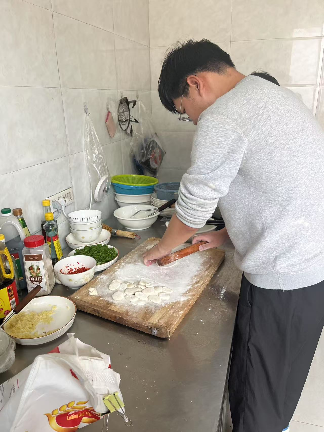 “下午兩位新人就要來(lái)了,咱得讓他們一到就嘗嘗咱項(xiàng)目部的家味道。”常師傅一邊麻利地剁著餡,一邊招呼大家分工協(xié)作。經(jīng)驗(yàn)豐富的常師傅負(fù)責(zé)調(diào)配餡料,生抽、香油的比例拿捏得恰到好處,韭菜豬肉餡餃子很快散發(fā)出誘人香氣;青年員工們則圍在餐桌旁,搟皮的手法行云流水,包餡時(shí)還不忘討論著“怎么捏花邊更漂亮”?!?/span>